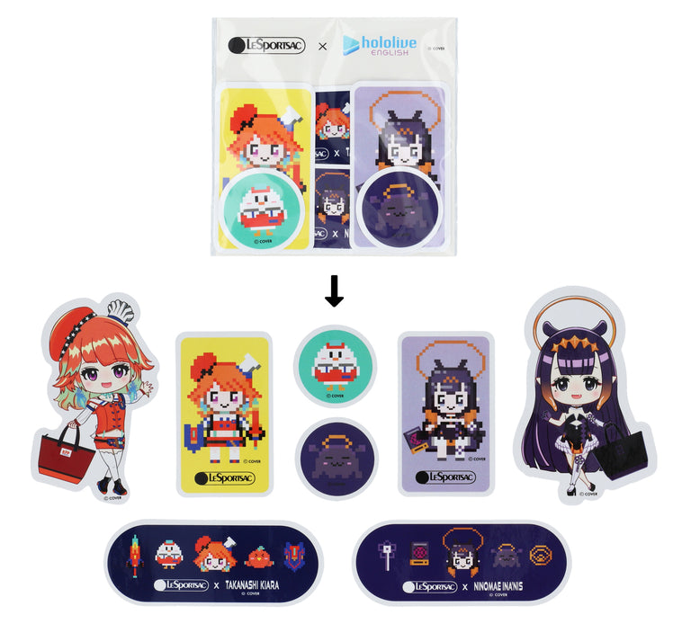pieces for each talent and one shared design. Each style features adorable artwork of Takanashi Kiara and Ninomae Ina'nis along with their loyal sidekicks and props.